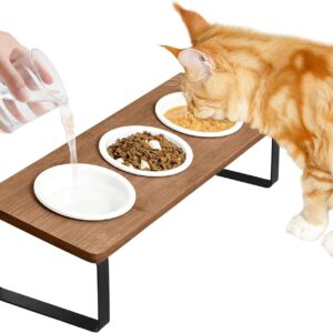 Raised Cat Food Water Bowl Elevated Tilted Kitty Dishes Set of 3 Ceramic Dish for Indoor Cats Orthopedic Pet Food Stand Anti Vomiting 3 Bowl Cat Feeder Easy Assembly(Brown)