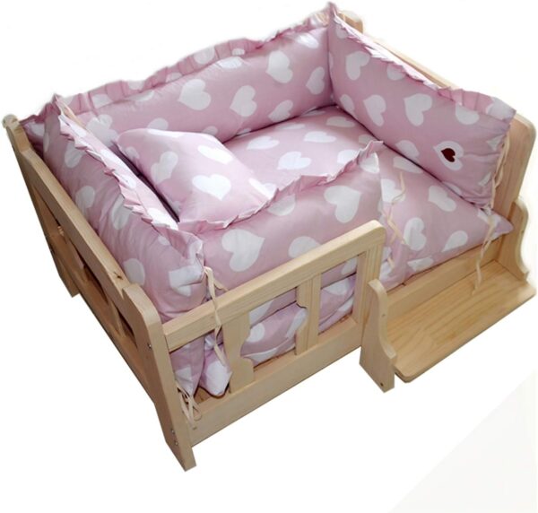 Indoor Outdoor Wood Dogs Bed with Rails and Stairs, Removable Mattress, Large Medium Small Elevated Pets Cots Sofa, Easy to Install (Color : Pink, Size : L 80×60×43cm)